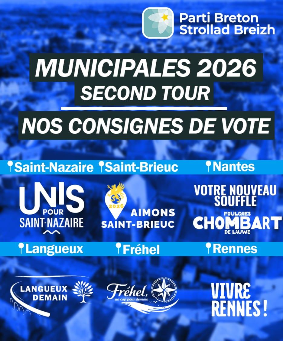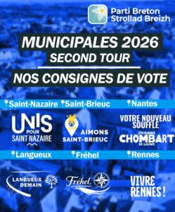 Le premier tour des élections municipales 2026 a permis au Parti Breton de présenter un nombre de candidats inédit aux élections municipales, les élections locales par excellence. Force est de constater que la mobilisation a payé, faisant intégrer une nouvelle génération de militants du Parti Breton dans les conseils municipaux, en particulier plus de jeunes et plus de femmes. Cette nouvelle implantation de notre parti renforce notre expérience « terrain » et notre ancrage local, tant dans les communes rurales, les villes moyennes que les métropoles bretonnes.